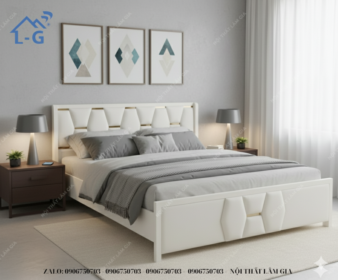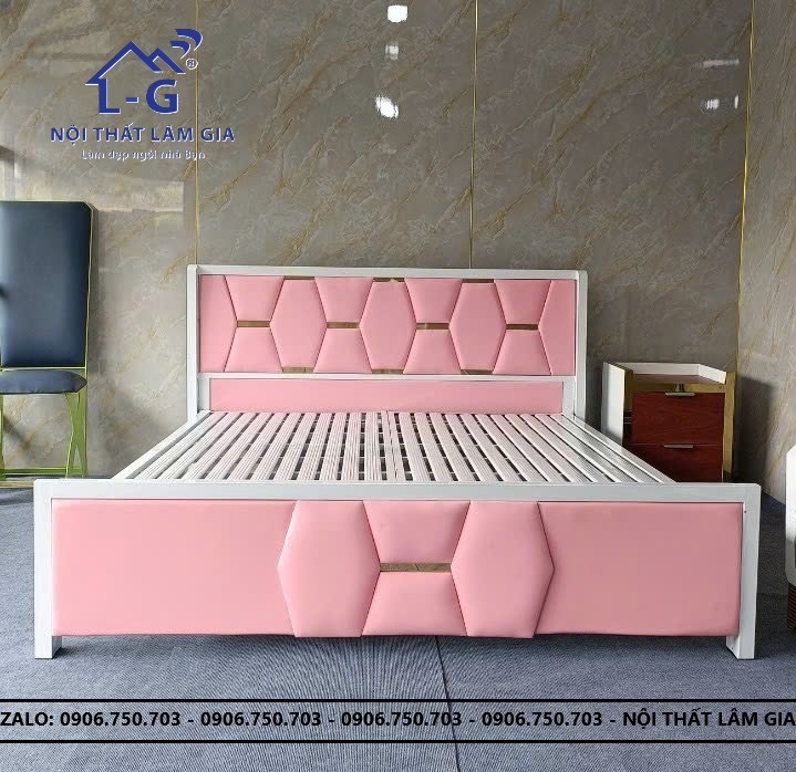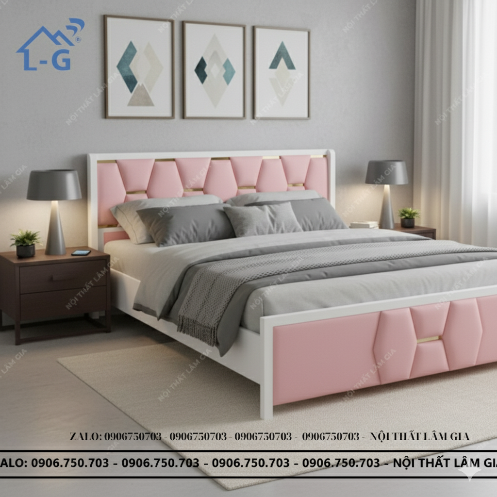 Mẫu giường này từ Nội Thất Lâm Gia là sự kết hợp hài hòa giữa phong cách hiện đại và nét thanh lịch của cổ điển. Điểm nổi bật là giường có ốp nệm màu hồng pastel và trắng, mang đến vẻ đẹp mềm mại và sang trọng. Giường được làm từ chất liệu sắt có độ bền cao, dễ dàng bảo dưỡng và mức giá phải chăng.